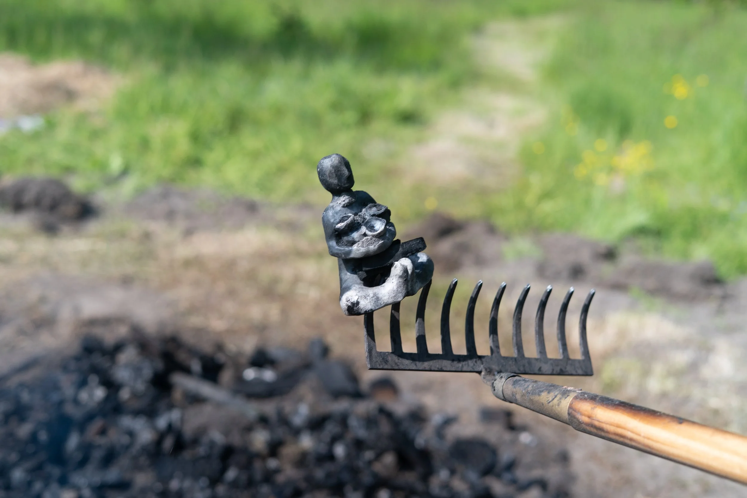 After a night of rest, the fire has burned for several hours. We will slowly uncover the pit and let the remains cool down. Once unearthed, the pieces can be dug up from under the ashes. We will wash them and analyze what happened during the fire. From the results on the surfaces, we will be able to trace back some of the components burned along with the ceramics. Finally, we will cover up the pit, making sure the land can recover.